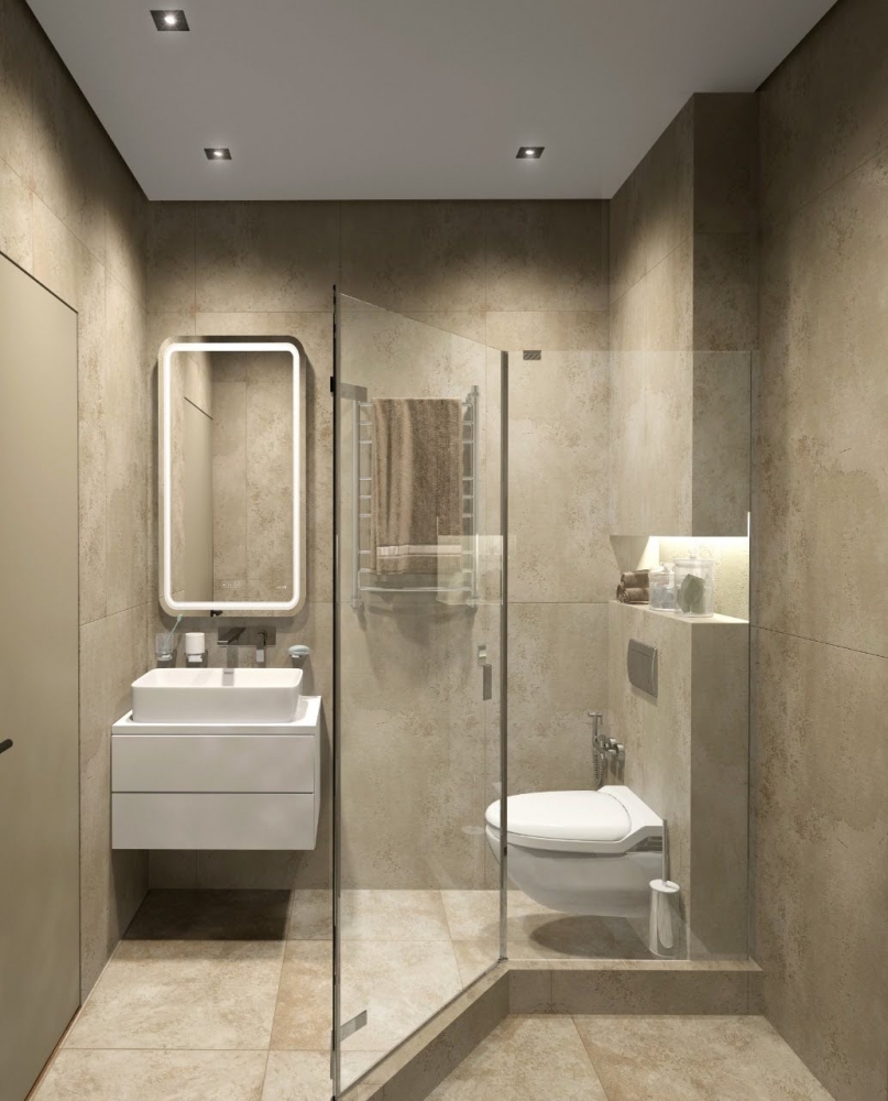 В санузле предпочтение отдано бетонным текстурам, а в качестве декоративного элемента в зоне умывальника использована плитка под коричневый мрамор. Интерьер всех комнат дополнен металлическими консольными светильниками, которые акцентируют внимание на отдельных предметах интерьера и значимых зонах.