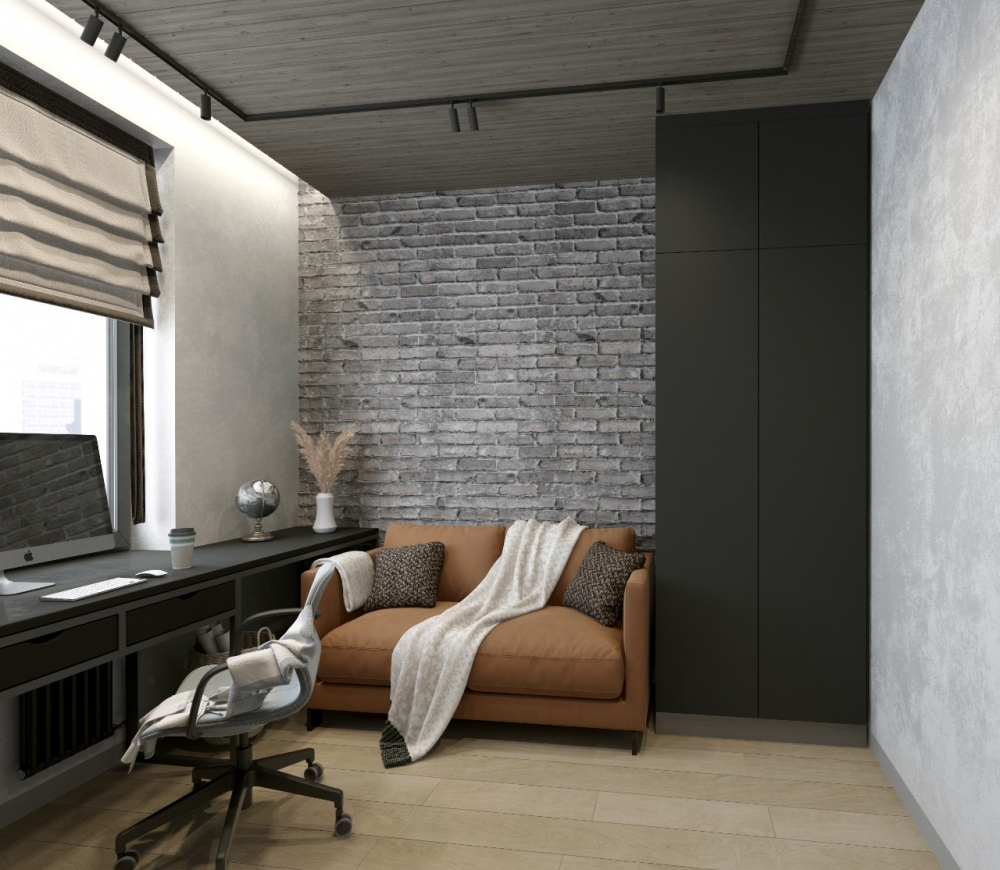 Чтобы квартира в стиле лофт выглядела брутально, но при этом была максимально приспособлена к современным стандартам, в этом проекте использовались оригинальные интерьерные решения в сочетании с традиционными элементами. В отделке преобладает сразу несколько материалов – это кирпичная кладка, натуральное дерево, металл. Неслучаен и выбор цветового оформления – дизайн-проект квартиры в стиле лофт выполнен с использованием черного, бежево-серого, а также оттенка натурального дерева.